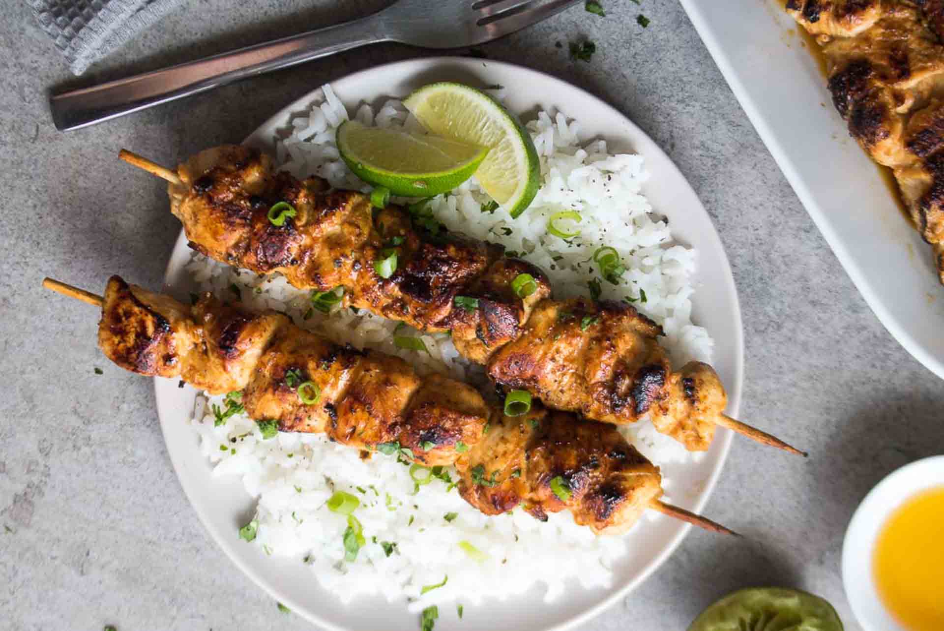 - Tavuk parçalarını püre edilmiş sosta marine edin, ardından ortalarından şişe takın.